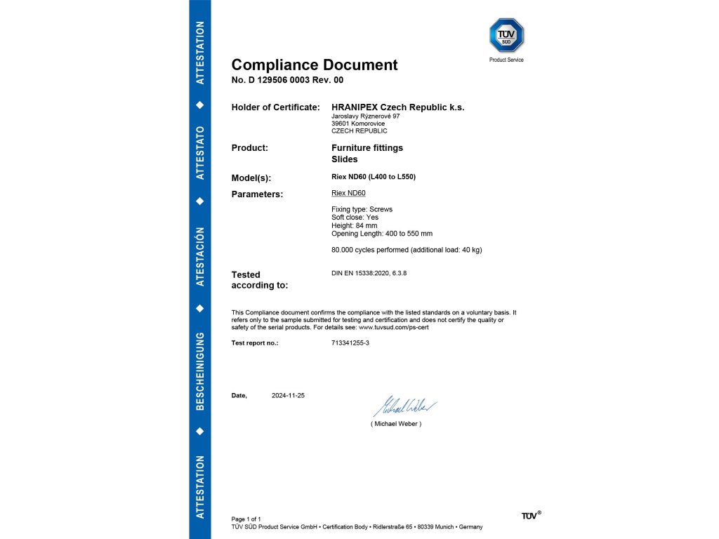 Zásuvky Riex ND60 s úzkou dvojitou bočnicí, nosností 40 kg a možností přidání relingů. Díky tlumení a synchronizaci se tiše zavírá a plynule pohybuje. Nastavení čelního panelu je možné ve svislém i vodorovném směru, což znamená, že při sestavování zásuvky získáte maximální flexibilitu. Díky úzkým bočnicím a široké škále příslušenství lze maximálně využít vnitřní prostor zásuvky, což z ní činí chytrou volbu pro jakýkoli projekt. Zásuvky Riex ND60 jsou k dispozici ve standardní tloušťce dna 16 mm a v tloušťce 18 mm, se kterými můžete celou zásuvku sestavit pouze z jedné tloušťky desky. Součástí balení 18mm verze je redukce pro 16mm desku + čelní příchyty.